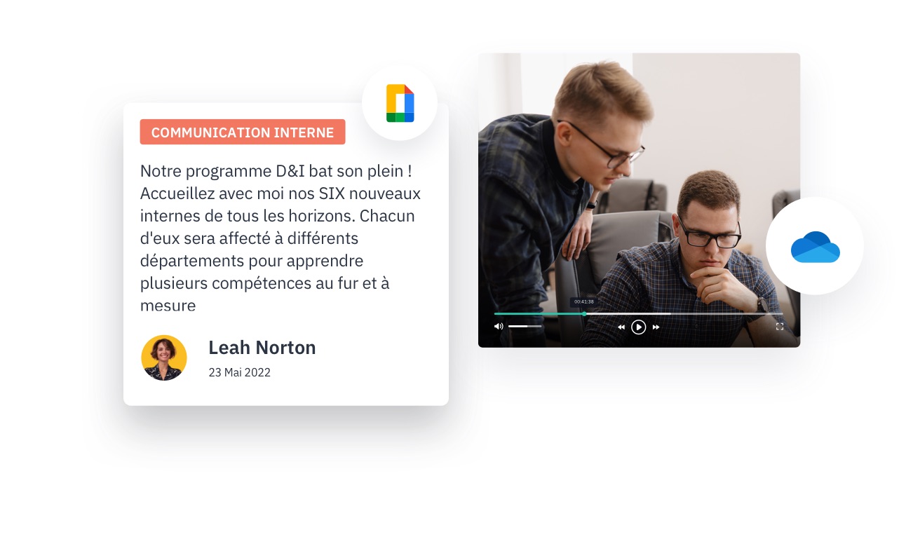 Ajoutez des widgets dynamiques avec accès direct à votre Drive, Calendrier, ou vos Communautés grâce à Happeo. Vous pouvez même mettre en iFrame des pages web entières. Vous voulez tous vos outils d’entreprise dans un seul endroit ? Créez vos propres widgets; avec très peu de codage, vous pouvez facilement intégrer votre CRM, votre logiciel RH, ou tout autre outil nécessaire.