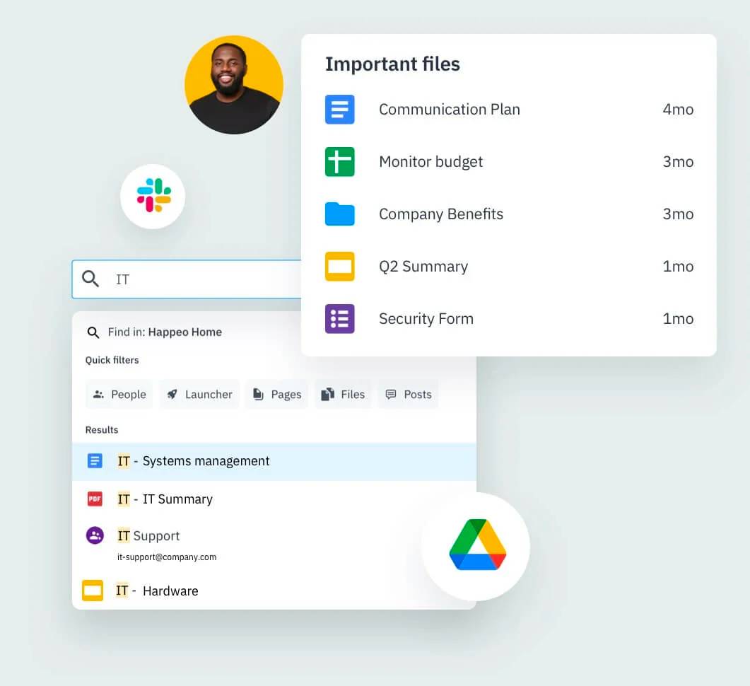 La plateforme de Knowledge Management Happeo est entièrement intégrée avec Workspace et Microsoft 365. Les fichiers sont synchronisés en temps réel avec Drive ou OneDrive pour éviter les doublons. Vous pouvez incorporer et modifier vos documents, présentations, et autres fichiers directement depuis la plateforme Happeo. Peu importe où est votre information, elle est trouvable dans Happeo.