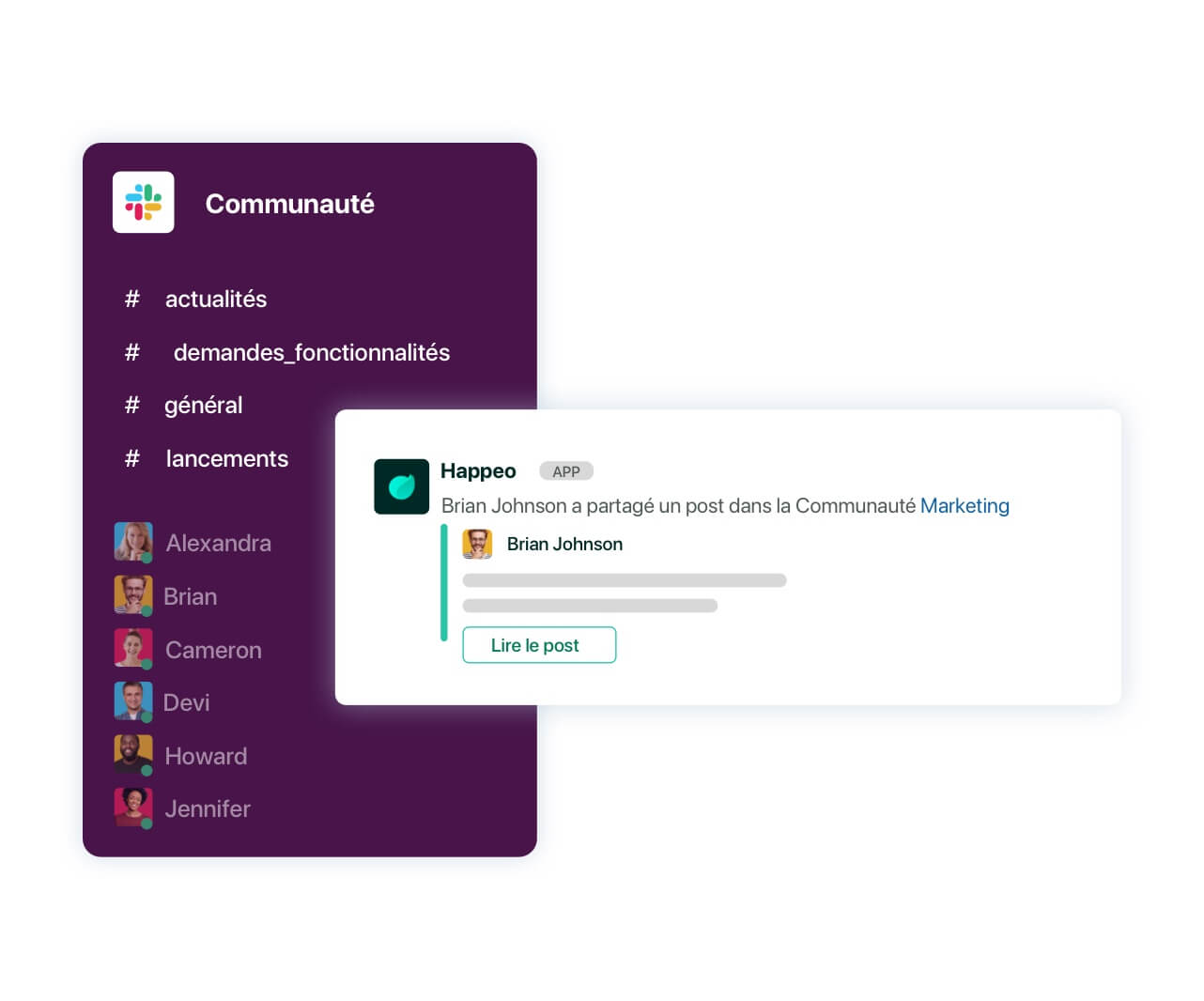 Pierre et Marie Curie. Sarkozy et Carla Bruni. Guillaume Canet et Marion Cotillard. Tenez-vous prêt pour le prochain couple mythique : Happeo et Slack. Slack s’occupe de vos besoins en termes de communication instantanée, tandis qu’Happeo vous offre un hub pour toutes vos annonces et actualités internes importantes - qui ne risquent plus de se perdre dans la masse.