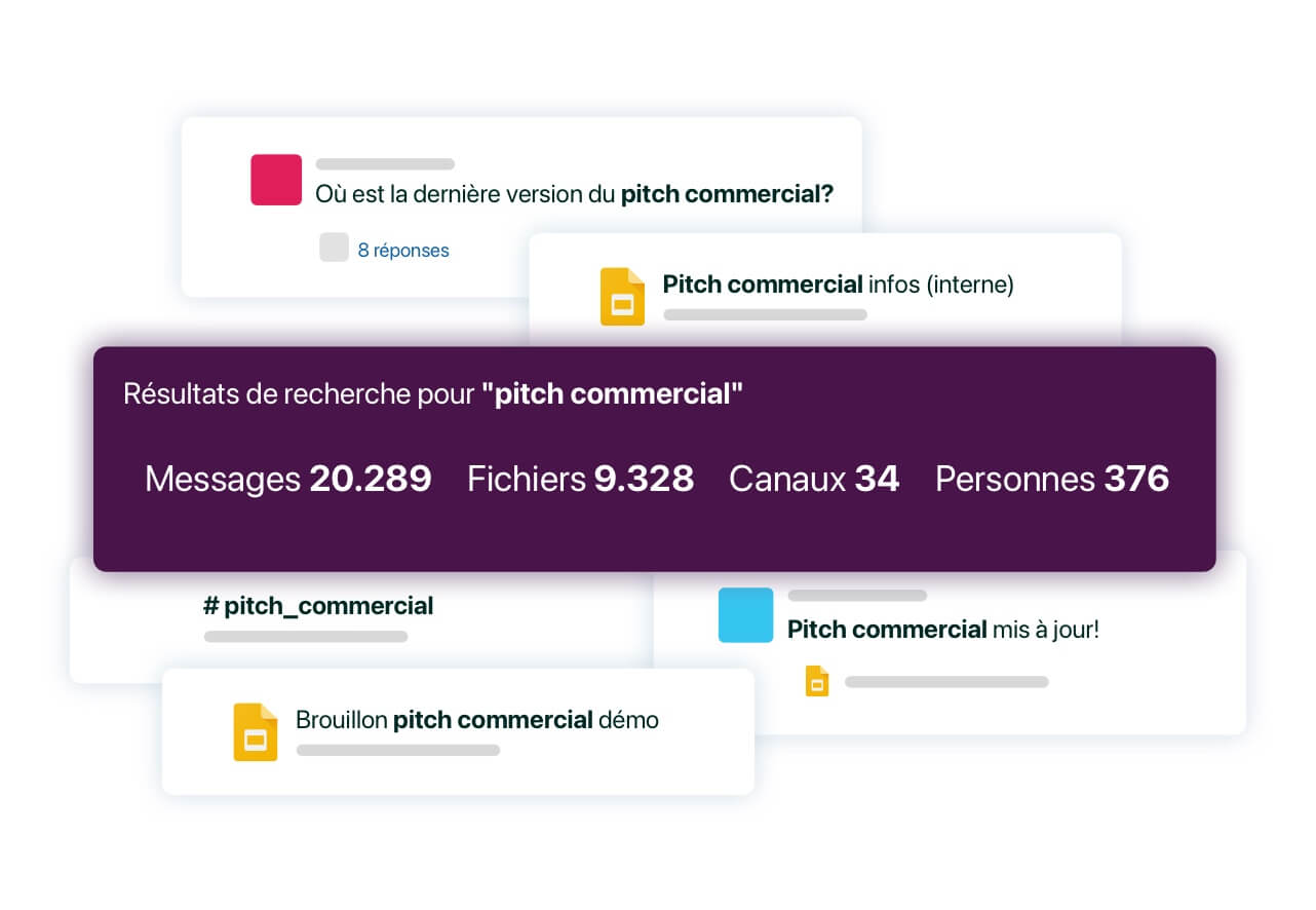 Quand vous utilisez Slack pour tout, trouver des renseignements peut vite devenir un parcours du combattant. Vos informations, bien qu’hébergées à différents endroits, doivent pouvoir être consultables en quelques secondes depuis un emplacement central.