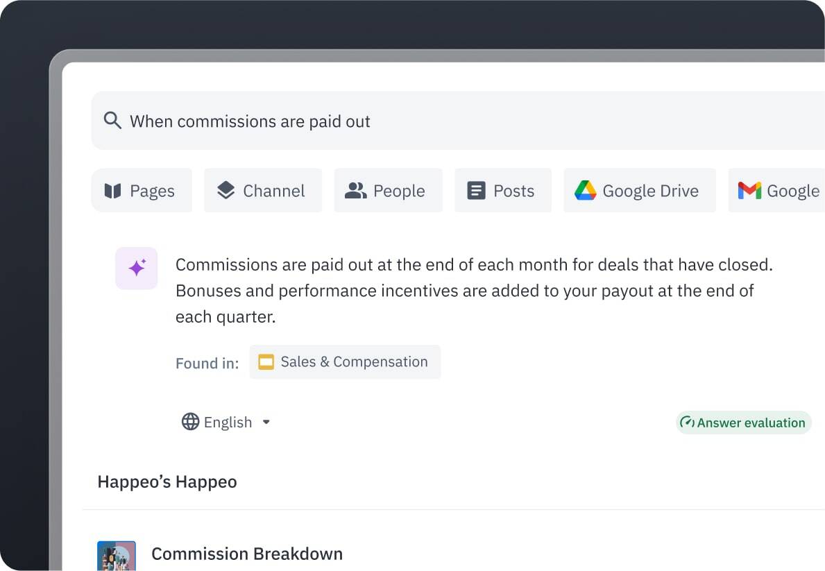When employees are working away from a desk, finding an answer shouldn’t be difficult. Search from the Happeo app across your intranet, Drive, email, Slack, and more so people can get what they need, and get going.