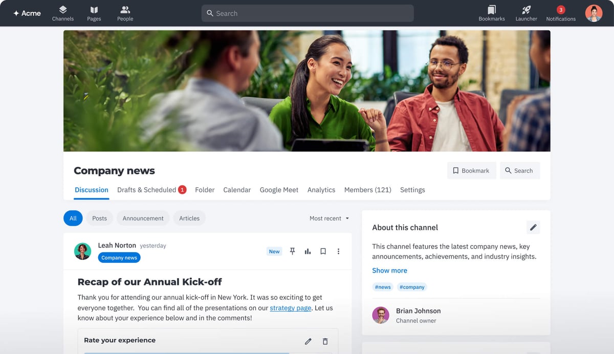 Let the personality of your people and your organization shine in Happeo Channels. Leverage widgets and incorporate images, videos, mentions, and tags into your Posts to create more engaging content.