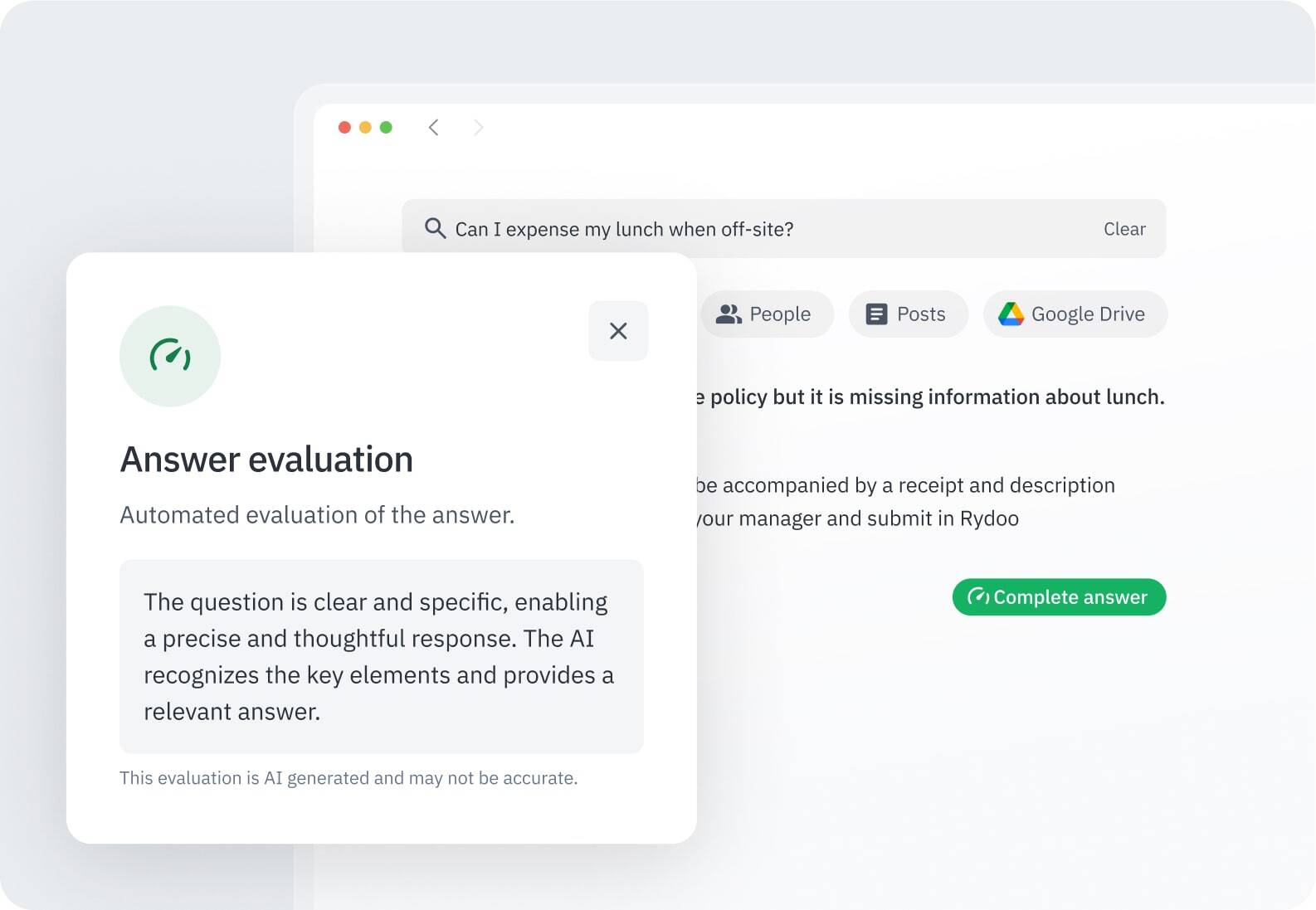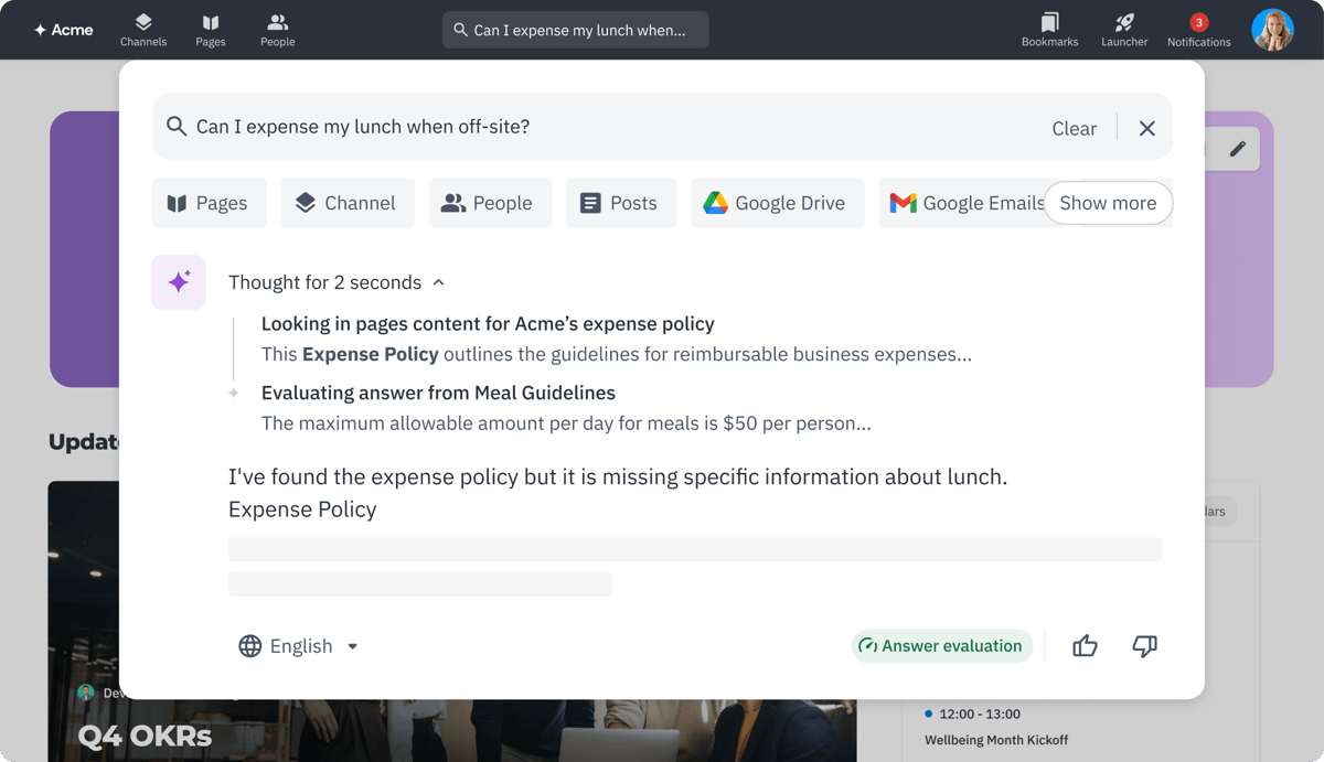 Happeo’s Search AI provides an accuracy gauge so that users know if they can trust answers, and also delivers the sources of the answers and recommendations on who to ask for any necessary clarification.