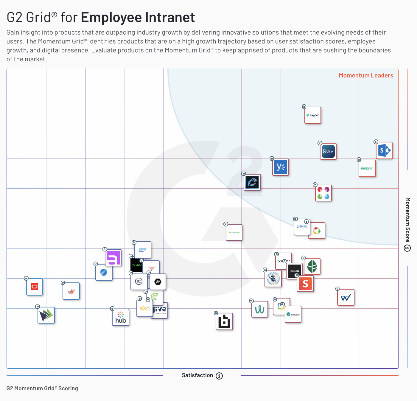 Their Momentum Grid shows “the growth trajectory that products have had in their respective spaces over the last year. The Momentum Grid identifies products that are on a high-growth trajectory based on user satisfaction scores, employee growth, and digital presence.”