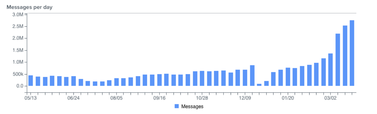 As workforces have moved to remote work, we’ve seen a big spike in the average daily messages sent within the platform. Daily average messages have risen from 500,000 at the beginning of the year, to over 2.5 million now, showing us just how much more people now rely on digital communication.