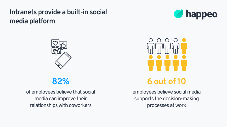 The digital world is run by social media, so incorporating relevant characteristics of social media platforms can have huge benefits in your employee intranet portal. Allowing a space for employees to connect with each other builds relationships within the workplace, which can lead to overall employee satisfaction. Internal networking also helps complete tasks. Studies show that 82% of employees believe that social media can improve their relationships with coworkers and 60% of employees believe social media supports the decision-making processes at work. A so called social intranet software can meet the social needs of your employees through coordinating events, congratulating each other on successes, or simply sharing information with one another.