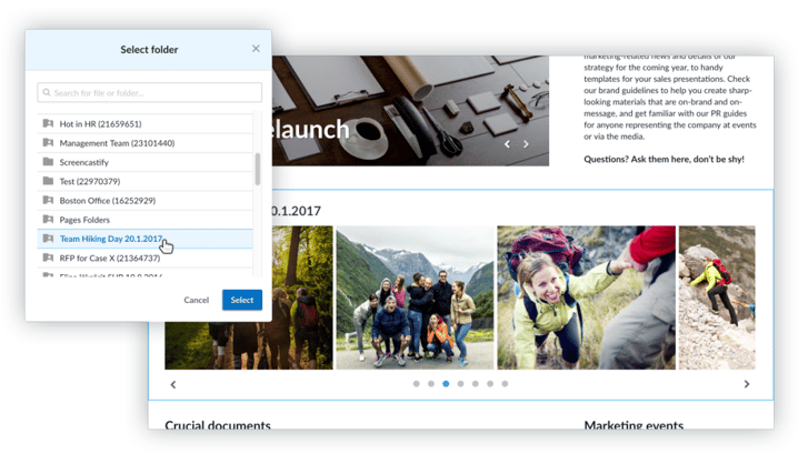 Now let’s take a look at how Team Drives and Happeo Pages complement each other. You can make sure everyone has access to the latest versions of important documents like company policies and marketing materials by linking a Team Drives folder to your static intranet page. All you need to do is add the Drive widget to the desired Pages collection and select the Team Drives folder you want to display.