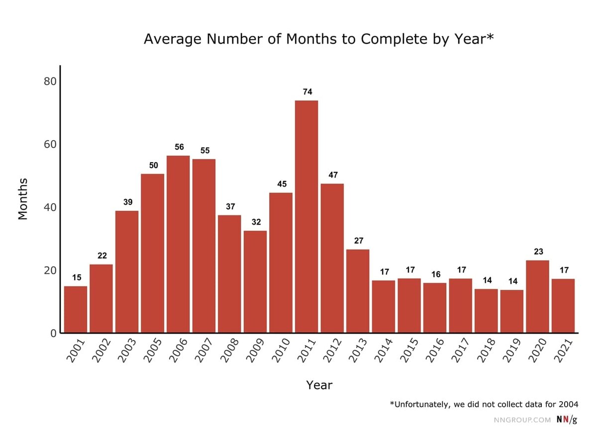 Research by the Nielsen Norman Group shows the average time of creating a virtual workspace shrank from just over 6 years (74 months) in 2011 to 17 months in 2021: