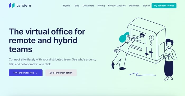 Tandem is a virtual office for hybrid and remote teams. With a single click, you can get a sense of what’s happening in your office, check who’s available to chat, and collaborate on projects.
