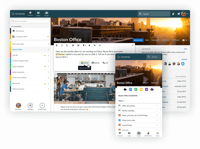 The modern intranet approach brings enterprise social to the forefront of Happeo. The homepage resembles the social media platforms that we love using in our private lives. Activity feeds keep users up to date with all the latest posts, comments and documents being shared in Channels, the virtual workplaces, they are members of. In this model, the intranet is really built around the employees, their daily work and the content they find most important.