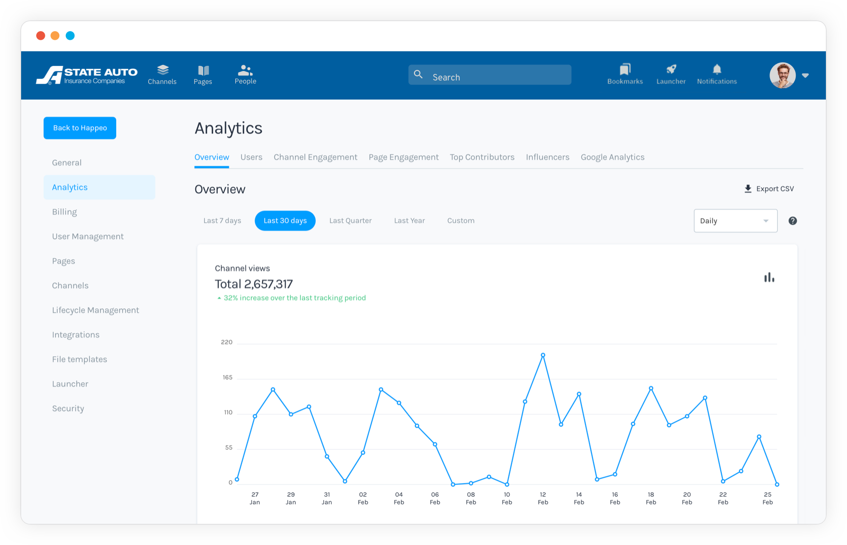 “Before implementing Happeo, for over 20 years State Auto was using a ‘one size fits all’ intranet that allowed no flexibility. We were looking for a platform that would permit us to communicate internally and be the tool for Internal Communications.