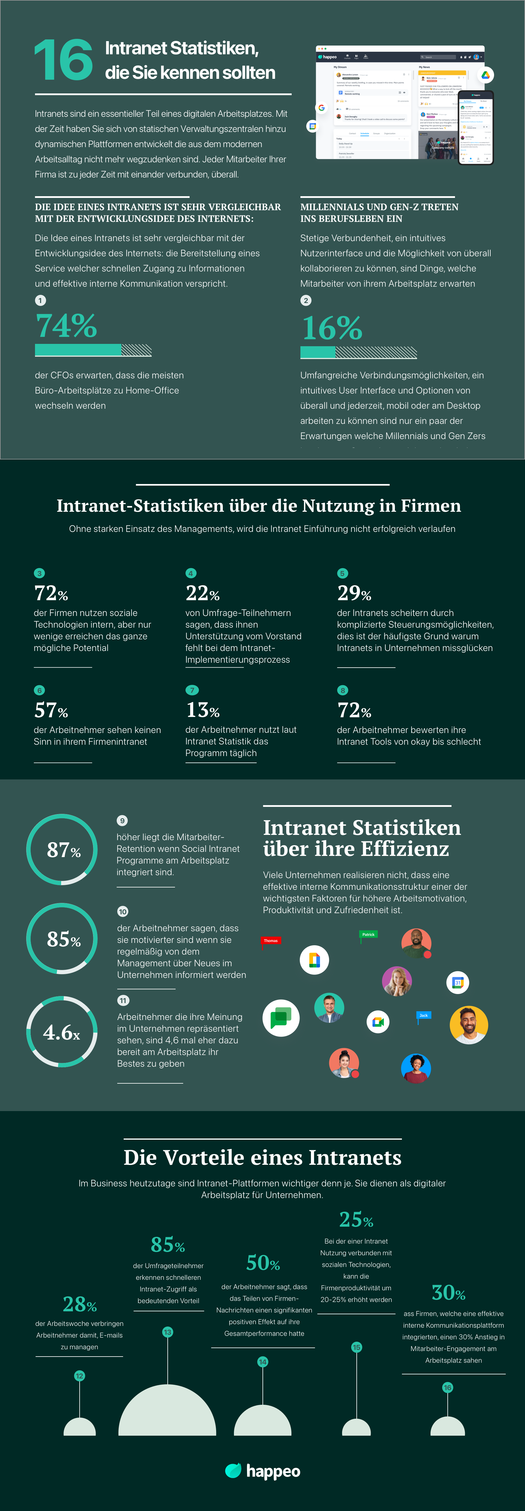 Leider schöpfen viele Unternehmen nicht das volle Potential gegeben durch ihr Intranet aus. Intranet-Plattformen wie Happeo ermöglichen nicht nur das Weitergeben von Wissen, sondern auch Kommunikation und Kollaboration zwischen Mitarbeitern. Im folgenden haben wir wichtigsten Intranet Statistiken für Sie zusammengestellt. Für weiteres Verständnis von den Intranet-Vorteilen und wie das Intranet heutzutage genutzt wird, schauen Sie sich die unten gegebene Intranet-Infografik an.