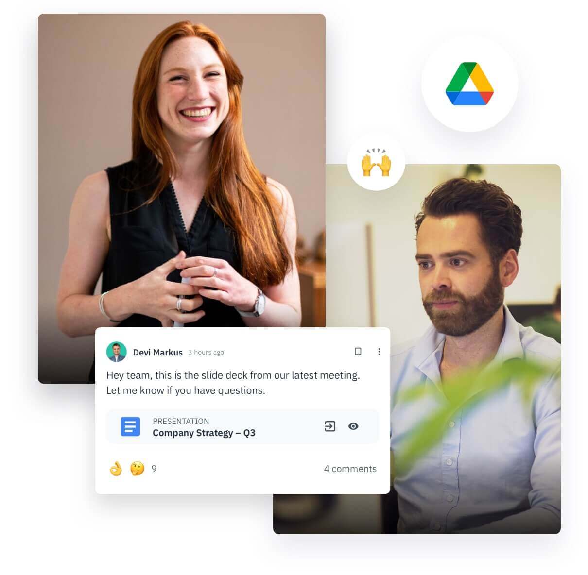 Der Versuch, Projekte über Desktop-Softwareanwendungen mit mehreren Mitarbeitern zu verwalten, kann schnell zu einem Albtraum werden. Durch die Integration von Happeo in Google Workspace hat Ihr gesamtes Team Zugriff auf die zuletzt aktualisierten Versionen Ihrer Dokumente.