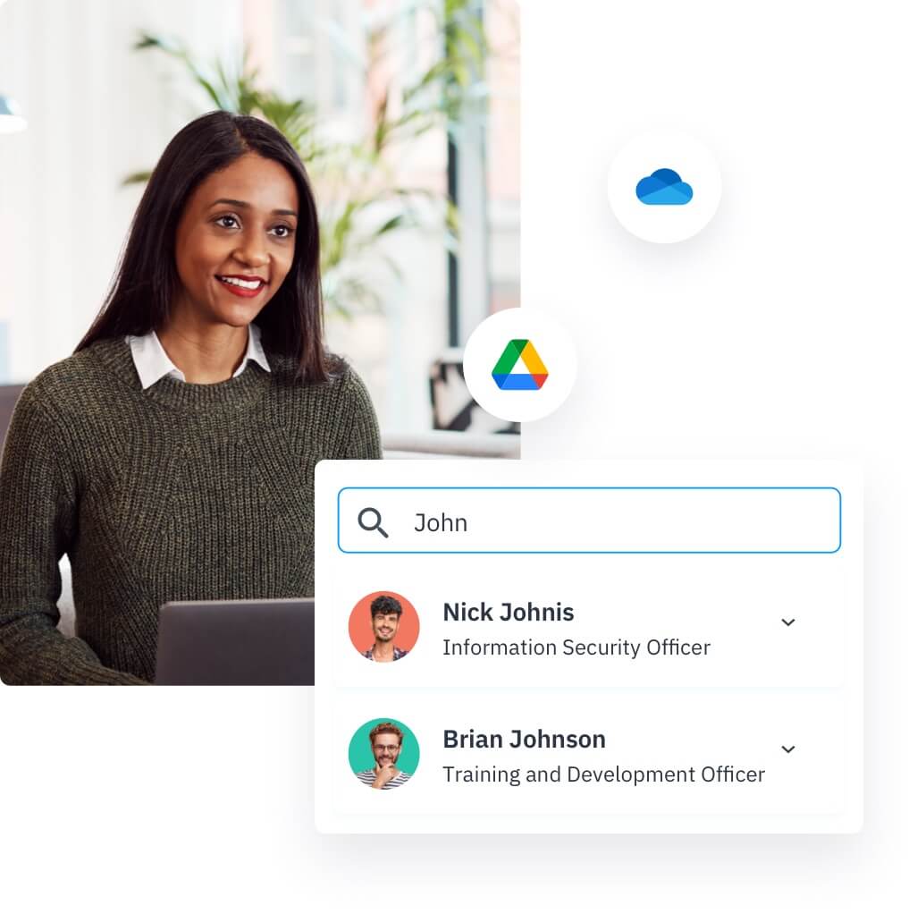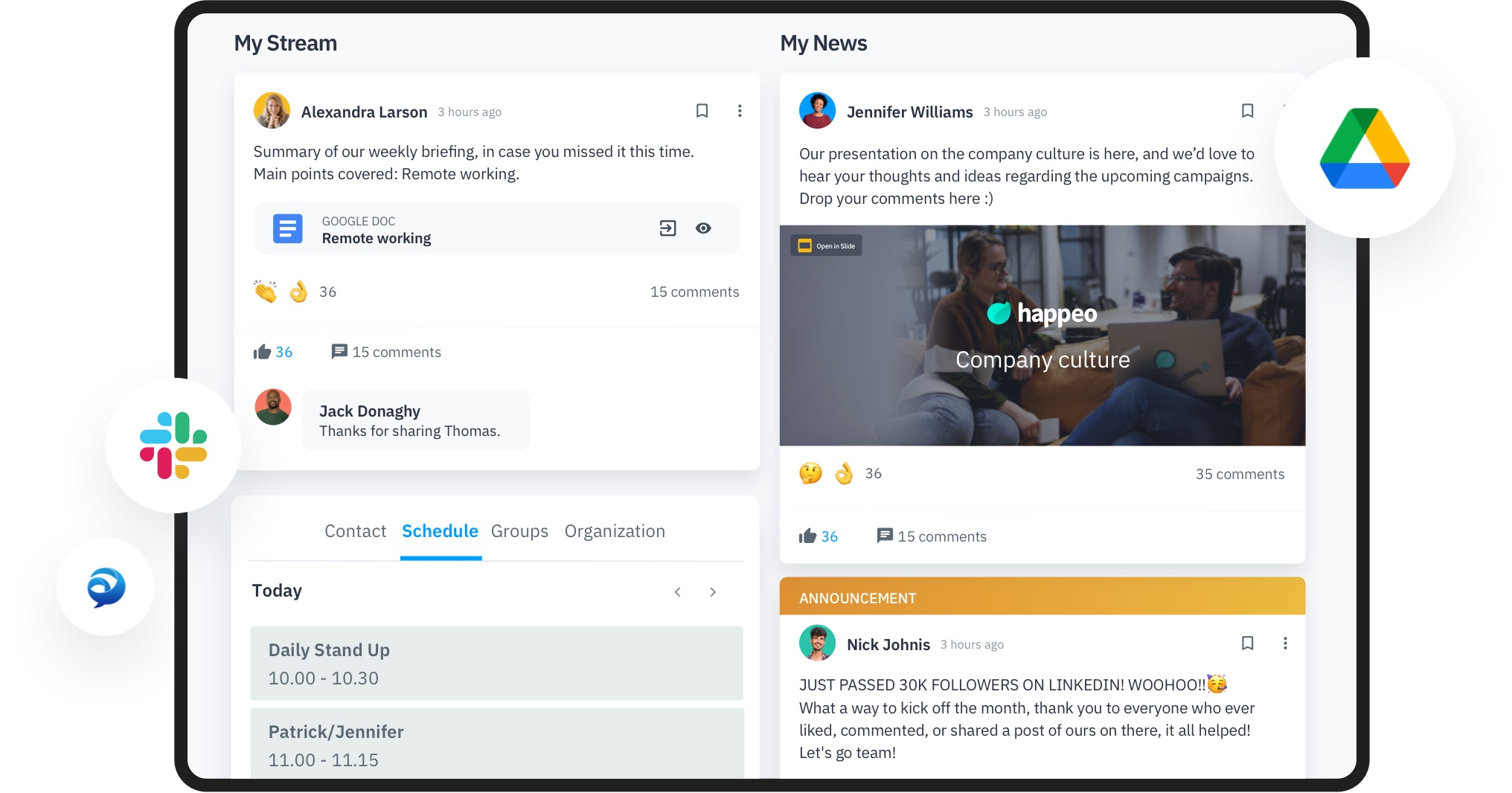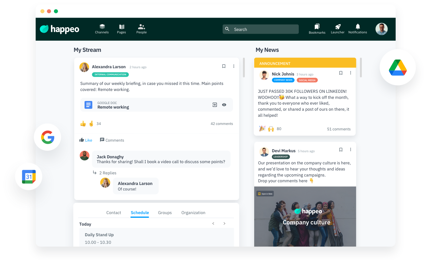 Finden, bearbeiten und Google-Drive-Dateien teilen, ohne Happeo zu verlassen.