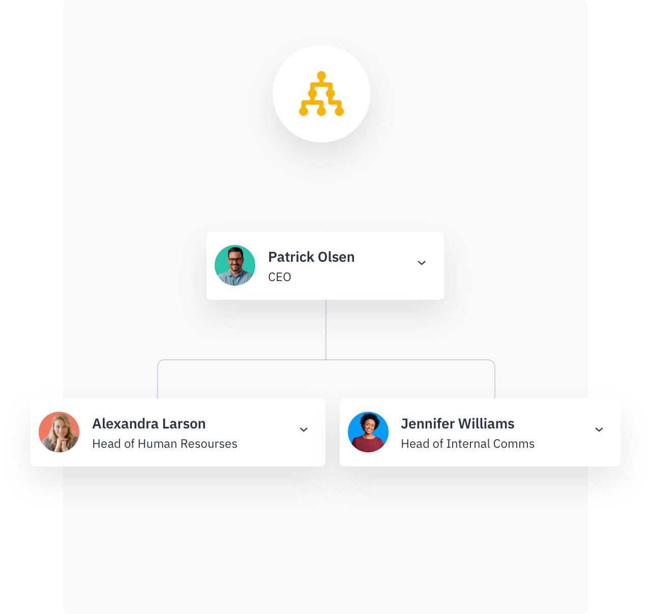 Teilen Sie das von Happeo automatisch erstellte Organigramm. So bleiben Ihre Mitarbeiter miteinander verbunden.