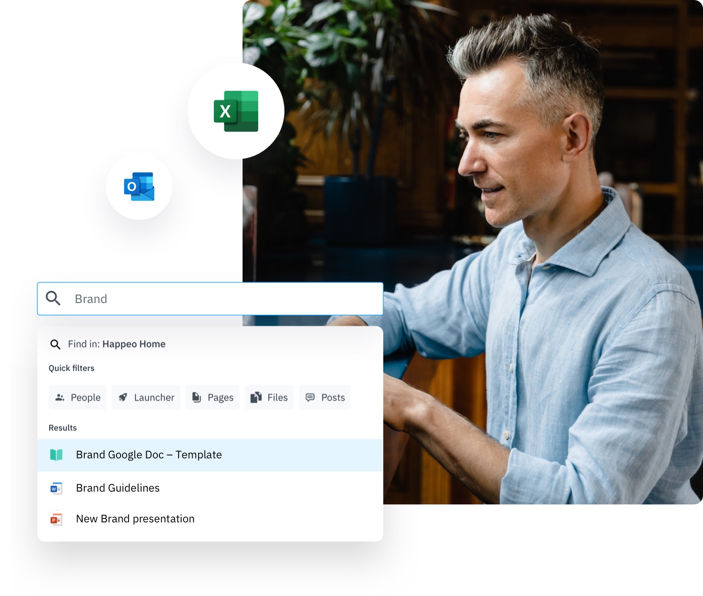 Happeo filtert alles in klare Kategorien, sodass Sie nie von der Vielzahl an Informationen überwältigt werden, die Ihnen zur Verfügung stehen. Der Schlüssel zu einer guten Suche ist, schnell zu finden, was Sie suchen – und genau das leistet unsere Suche.