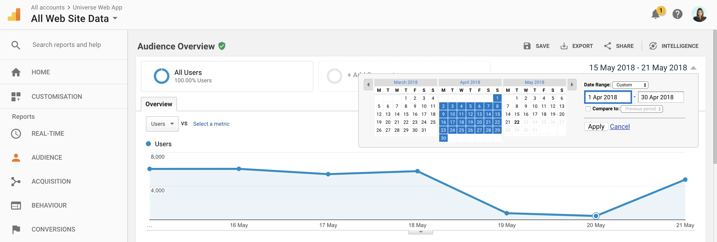 Sélectionnez toujours la période que vous souhaitez examiner en premier lieu. Vous pouvez le faire dans le coin supérieur droit. Si vous le souhaitez, vous pouvez également comparer différentes tranches de dates les unes par rapport aux autres.