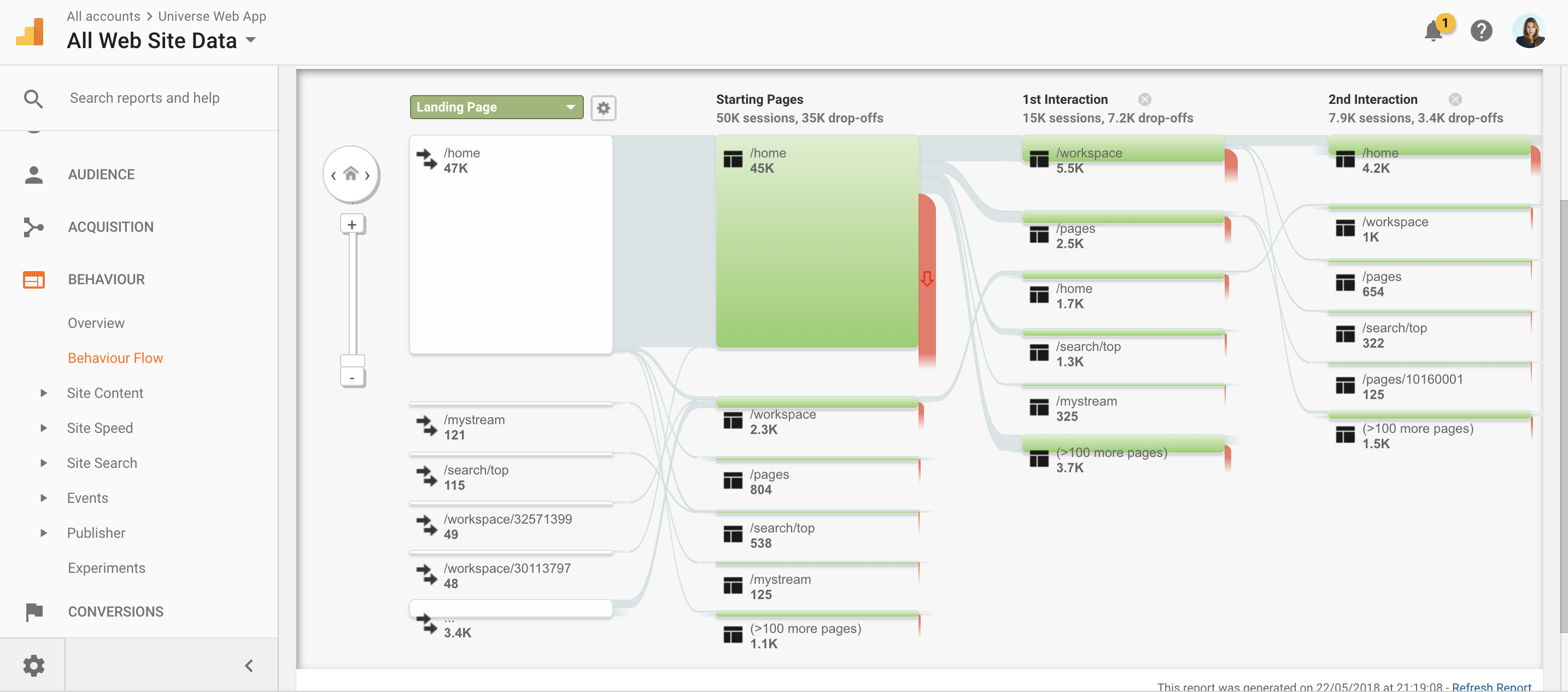 En plus de la mesure ci-dessus, un autre rapport intéressant est le "rapport sur le flux de comportements" (Rapports -> Comportement -> Flux de comportements). Ce rapport permet de suivre le chemin parcouru par les utilisateurs dans Happeo, de la première page visitée à la dernière page visitée avant de quitter. Le flux de comportement montre comment vos utilisateurs naviguent dans Happeo.