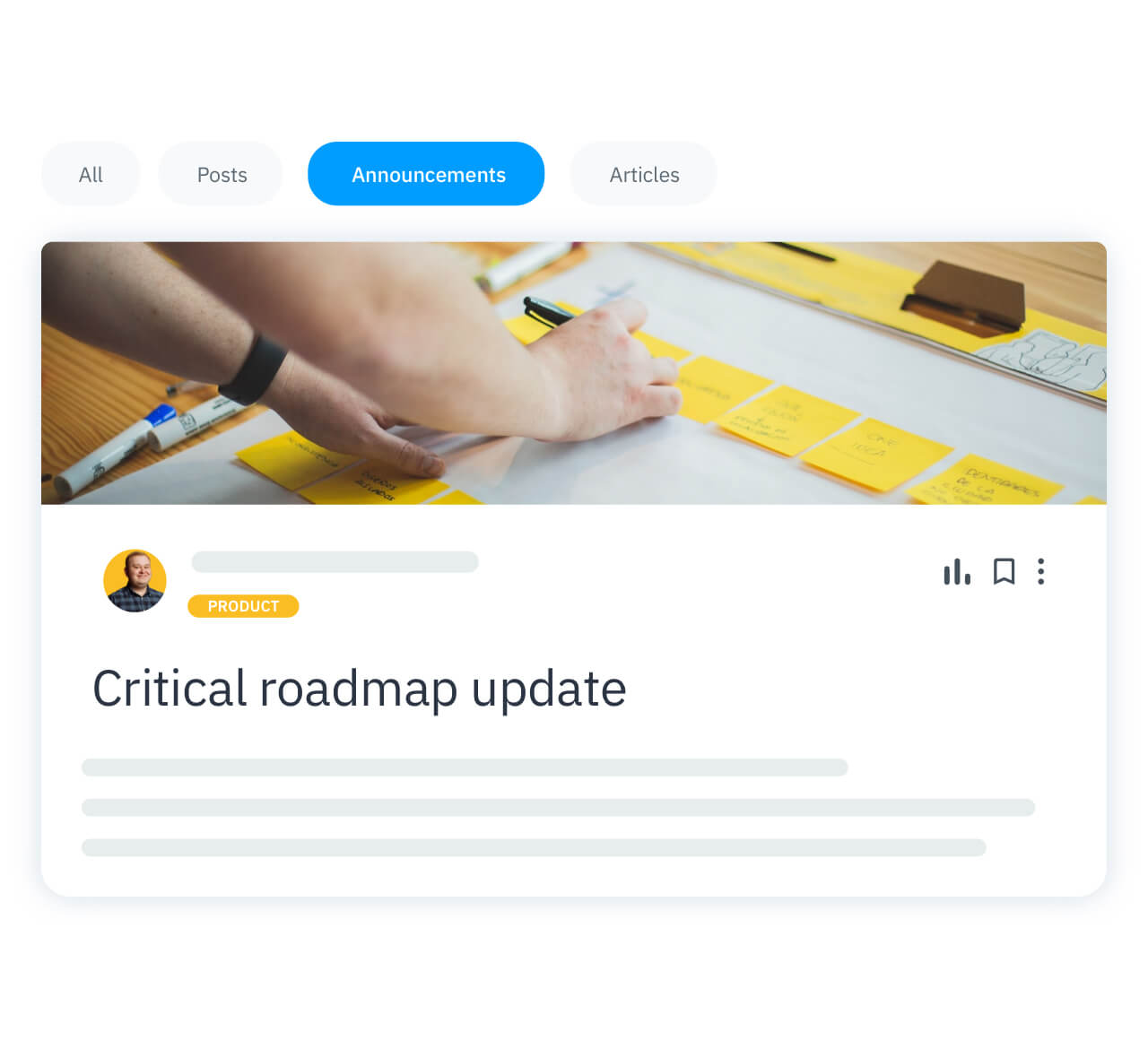 Happeo fait en sorte que les annonces importantes soient partagées avec les bonnes personnes, communautés, et équipes pour une communication descendante efficace et simple.