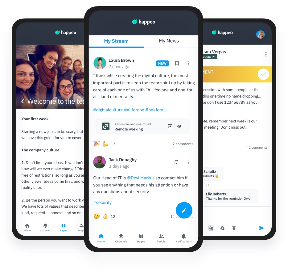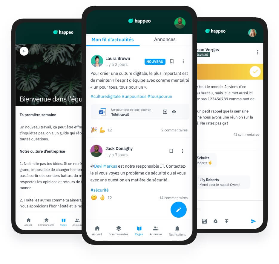Que ce soit depuis un ordinateur ou un téléphone portable, toute personne au sein de l’entreprise ou sur le terrain peut accéder à Happeo à tout moment - et toujours avec le même niveau de sécurité.