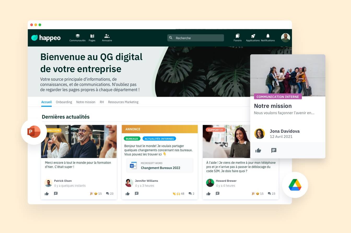 « Happeo est une plateforme user-friendly et personnalisable pour une meilleure communication et un lieu de travail numérique. Il est simple de créer une plateforme interne personnalisée pour diffuser des communications internes, des actualités, et des ressources selon les besoins des employés grâce à des modèles pré-construits. »
