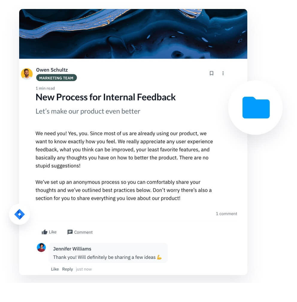 Permettez un partage des connaissances dans votre entreprise grâce aux communautés. Vos employés peuvent publier, partager, liker, et commenter des posts pour informer leurs collègues des derniers développements du marché ou des dernières mises à jour internes de l’entreprise.