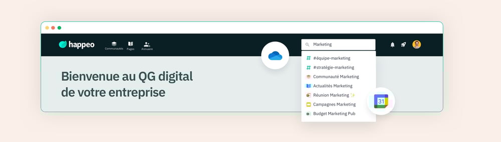 Boostez la productivité de vos équipes en facilitant l’accès à votre contenu. La Recherche Globale d’Happeo permet à vos employés de rechercher et trouver la bonne information à travers votre contenu intranet, Google Drive, One Drive, etc. Le tout depuis une seule barre de recherche.