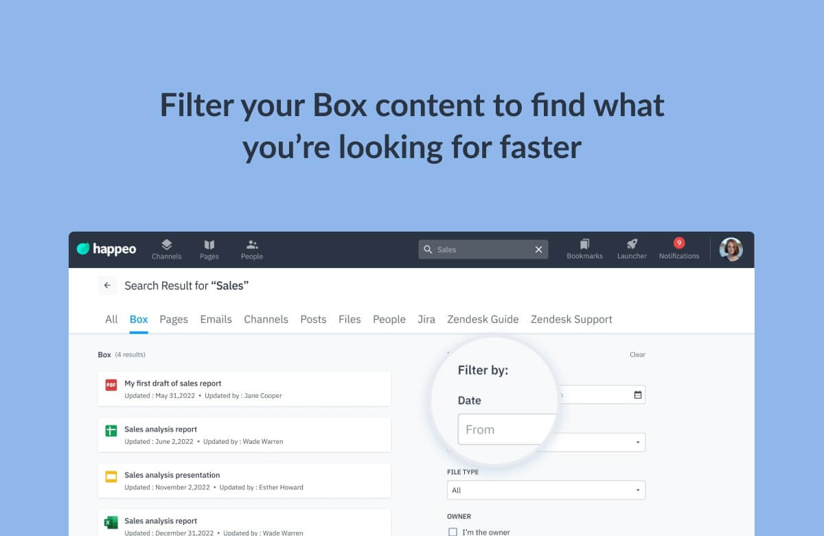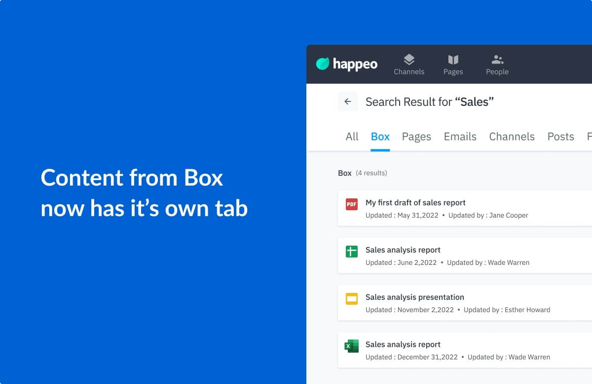 Federated Search connector for Box. Installing this allows you to search content in Box from your Happeo Search bar.