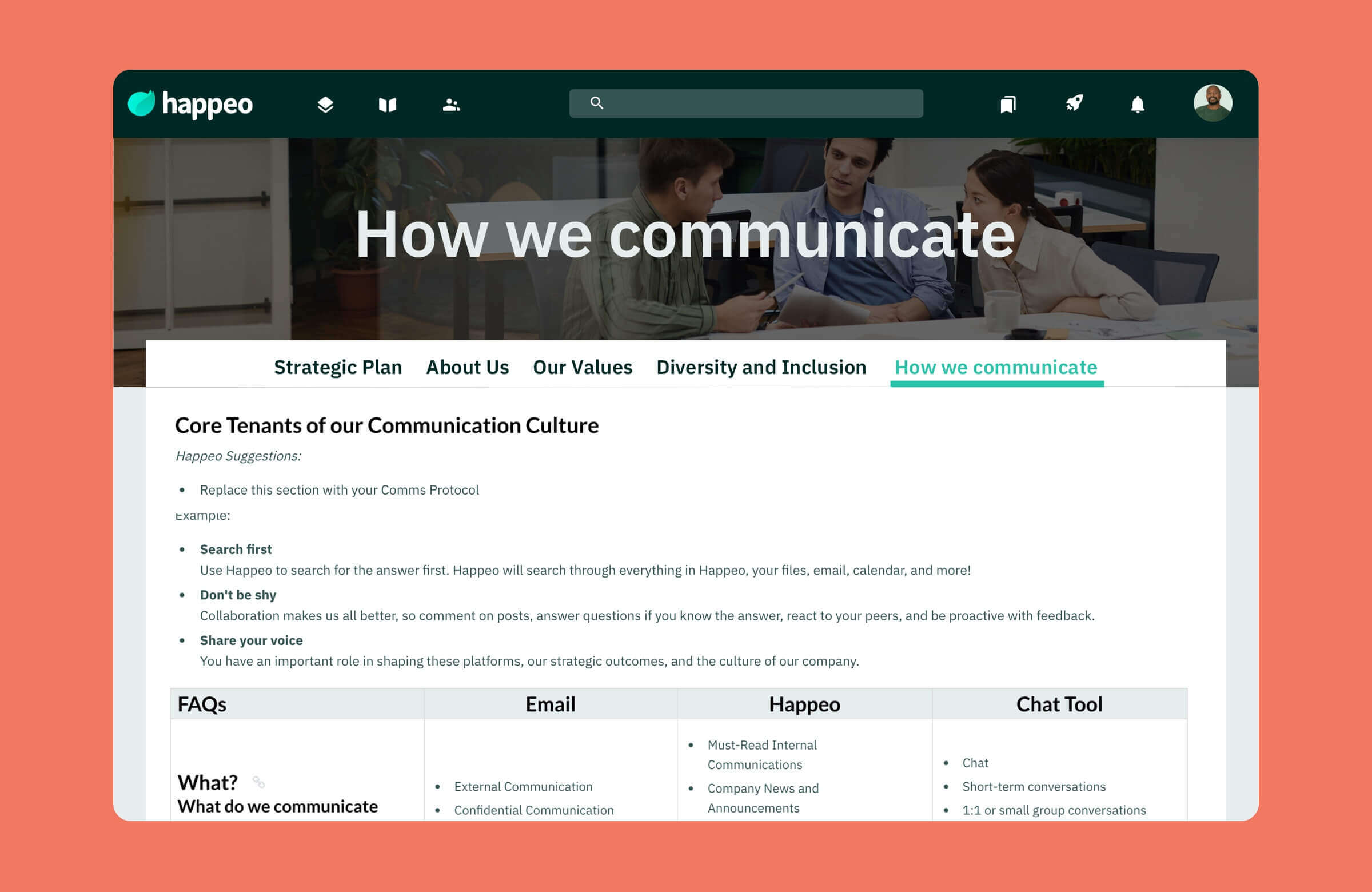 Use this company culture page to share your company history, values, strategic plan and more. Help your employees stay up-to-date and aligned with your business objectives. Help onboarders understand the company culture, and help keep momentum going between Quarterly Kick Off Meetings so no one forgets the key initiatives they should be focusing on.