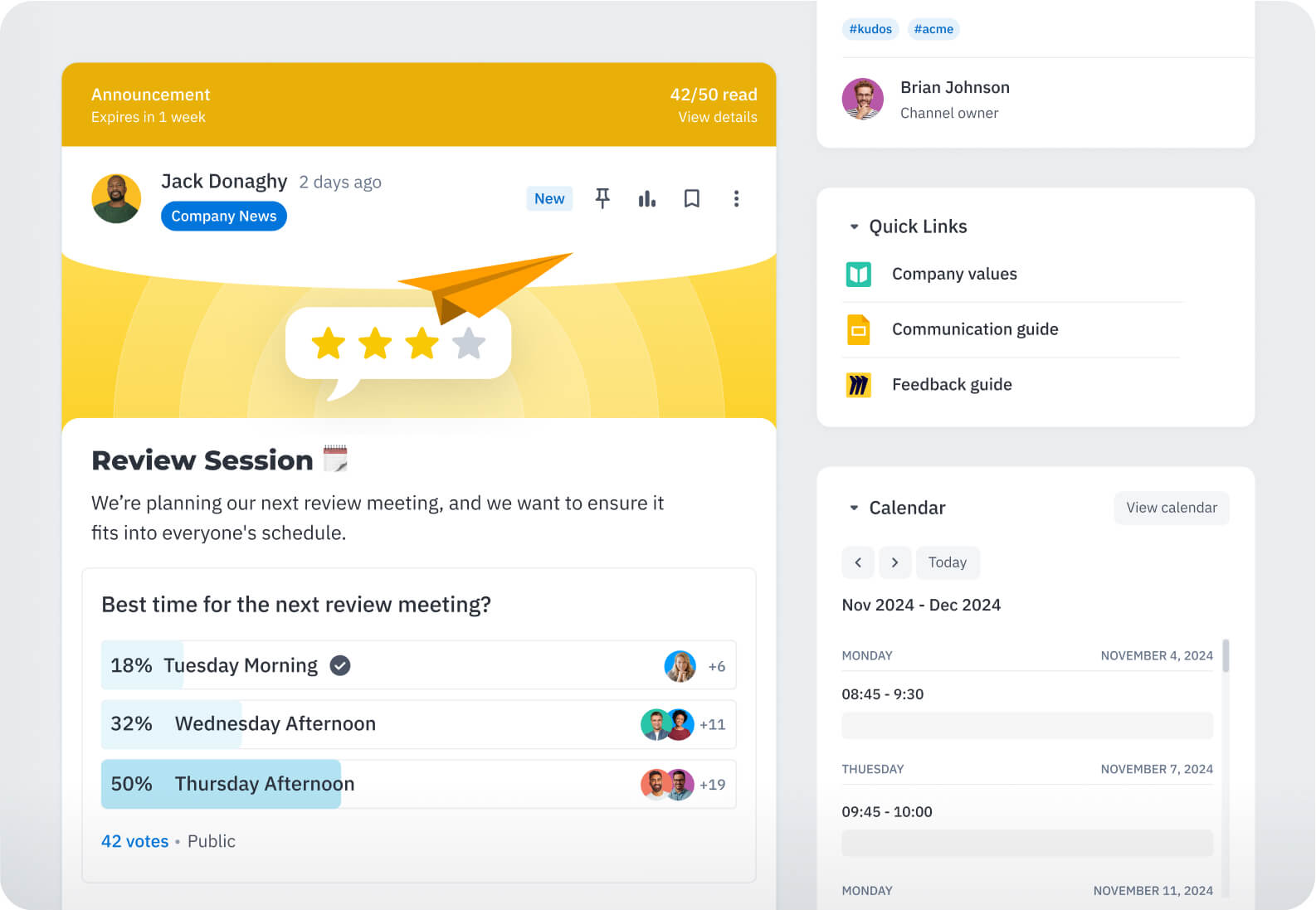 Happeo Polls help you empower your workforce to share their voices and gain valuable insights directly through Happeo Channels, driving informed decisions across your organization.
