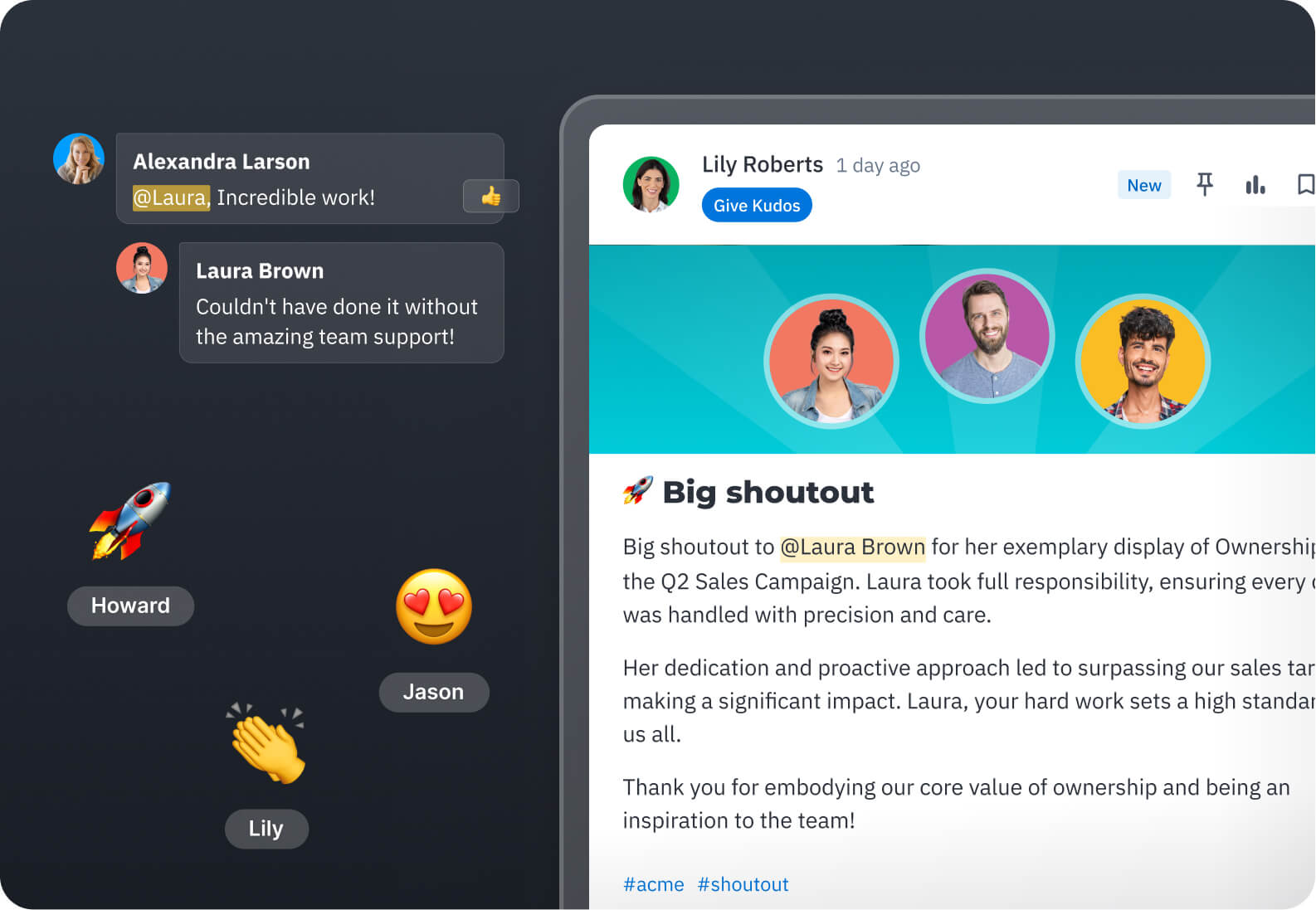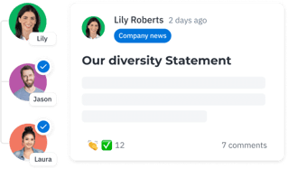 Easily share and collaborate with Happeo Posts. Target relevant audiences, respond with reactions and threads, and up-level your Post to an Announcement or Article, with scheduling options built in.