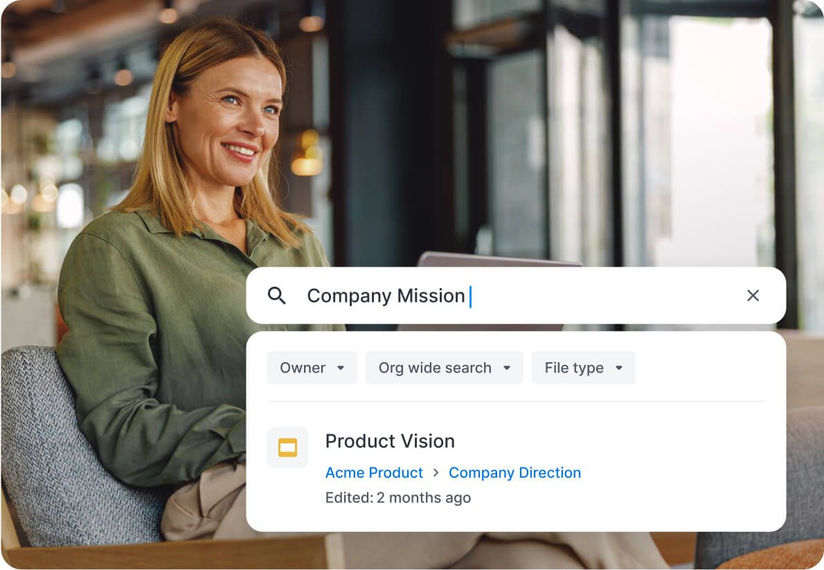 Reach outside your knowledge ecosystem and easily across popular external platforms such as Asana, Box, Dropbox, Jira, SharePoint, Confluence, Miro, Trello and Zendesk..