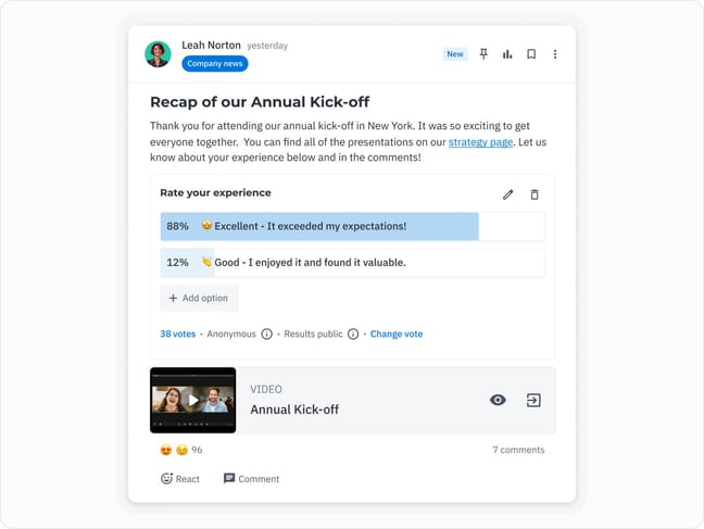 Rich visuals, videos, polls, and embed capabilities pack a punch of personality and style that showcases your company and culture.