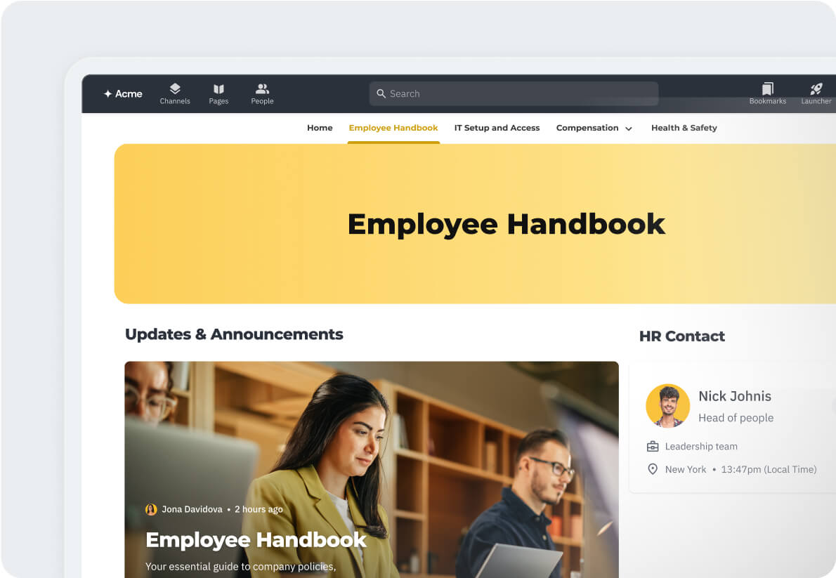 Get new hires up to speed and engaged using the same intranet they’ll use every day. Happeo is the perfect space to store training materials, policies, and HR documentation in a centralized location.