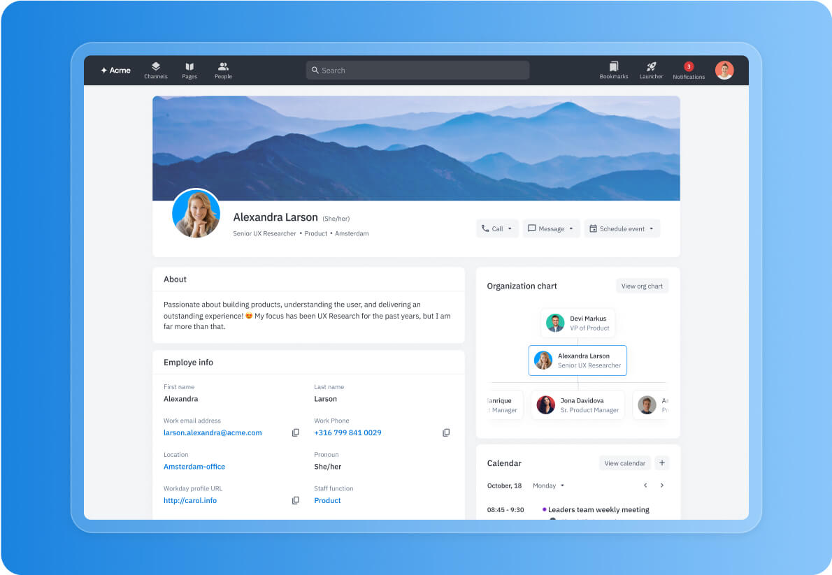 Get to know your colleagues by exploring their user profiles, including specifics about their role, their time zone, calendar, and seamless contact options.